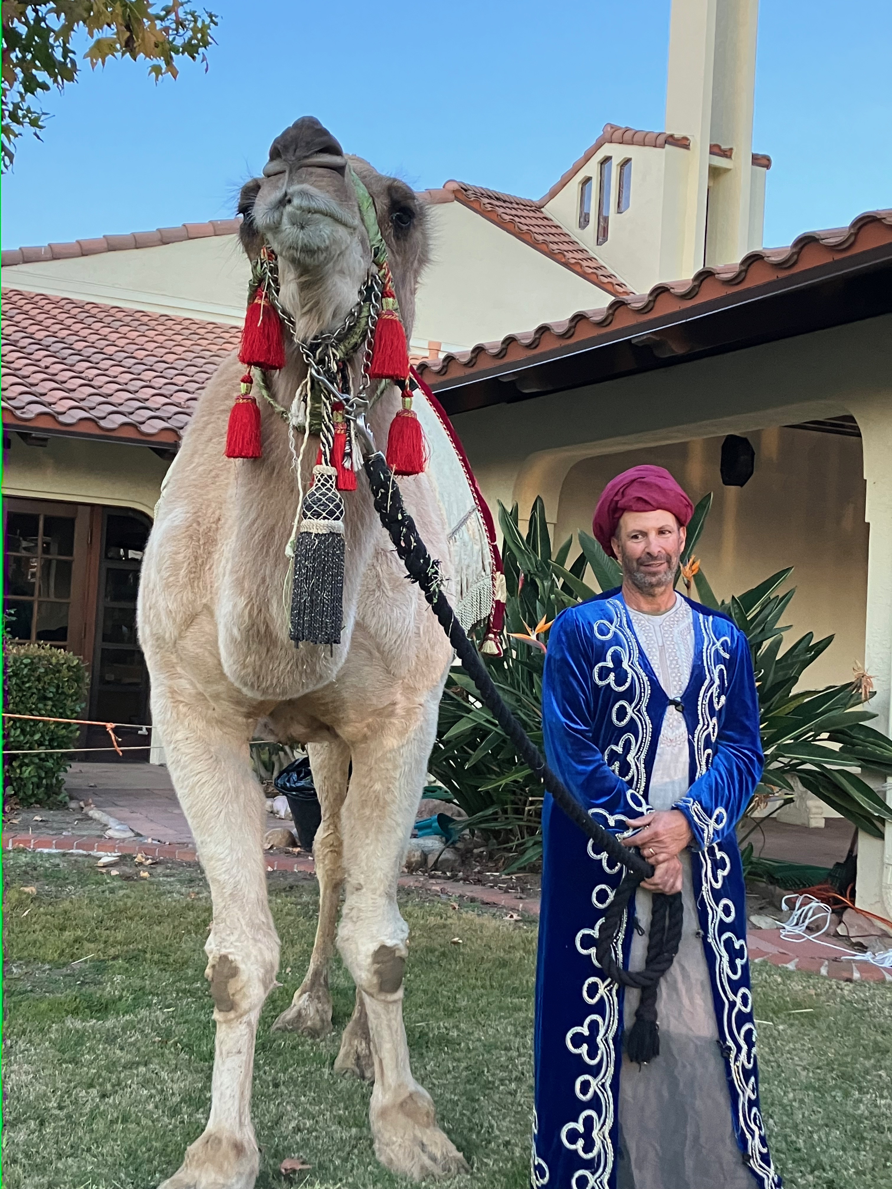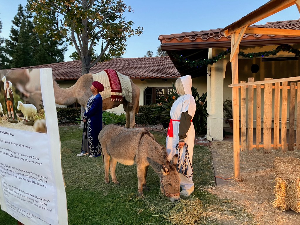 “Where would anybody find a camel around here?” I wondered. “At the zoo?”  Intrigued, I showed up at the church’s front lawn just before sunset on a balmy Saturday evening to see for myself. Sure enough, there was a regal-looking camel, festooned with a decorated blanket and tassels and bells. Standing beside the camel, holding its halter, was a swarthy bearded man in a long embroidered robe. He represented one of the three kings bringing gifts for the baby Jesus. The nativity also included a couple of sheep, some goats, and a donkey, in addition to the three humans representing the Holy Family.