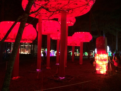 For the past several years, a traveling exhibit of LED-lit silk-skinned “lanterns” has come to our North Carolina town during the darkest period of winter. Last year on the night I attended the festival, the air was bitingly cold. Crowds were sparse. This year, on a clear weekend evening a good bit warmer than typical for early January, I ate an early supper, then put on a hoodie, drove to the festival site, parked in a free adjacent lot, and walked to the box office to get a ticket. I arrived a little after the festival’s 6 p.m. opening—once the sky was dark enough to provide a good backdrop for the thousands of lanterns and fanciful lit shapes.